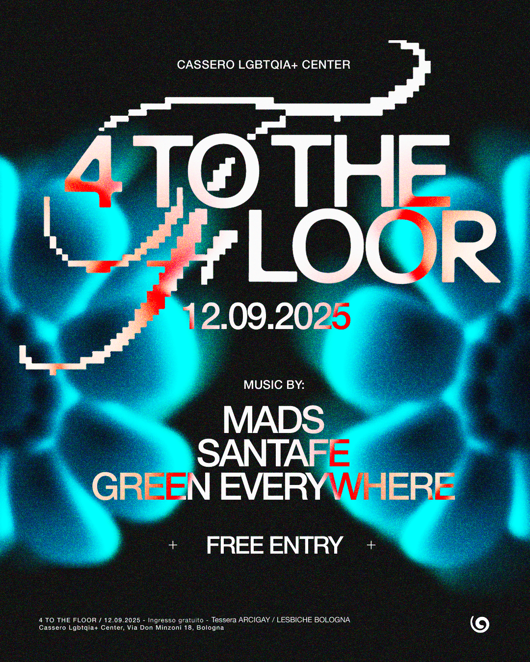 Cassero LGBTQIA+ Center Via Don Minzoni 18, Bologna, BO, Italia💫 4 TO THE FLOOR 💫 Torna l'electrohouse al Cassero! A ingresso gratuito ✨ 🎵 Dj set by Mads @mads.rec (https://www.instagram.com/mads.rec/) Green Everywhere @sgreeneverywhere (https://www.instagram.com/sgreeneverywhere/) Santafe @santafe.dj00 (https://www.instagram.com/santafe.dj00/) 4 to the floor music all night long: 4 you, 4 everyone, 4 ever. Mads, Green Everywhere e Santafe condivideranno la console come condividono la…